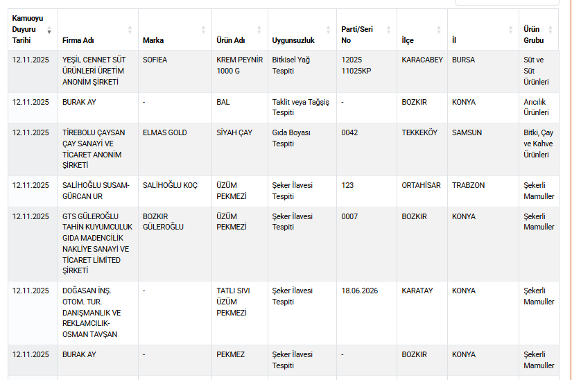 Bakanlığın yayımladığı listede yalnızca çay ürünleri değil, farklı kategorilerde çok sayıda üründe de çeşitli uygunsuzluklara rastlandı.