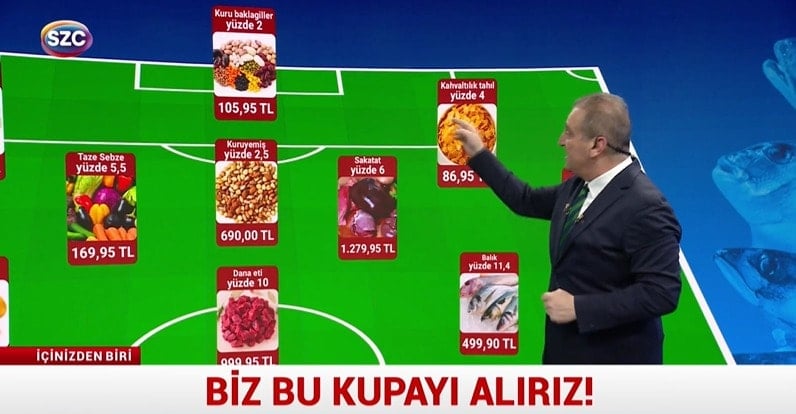 – Hücumda Aralık ayının etiket şampiyon takımı. Patates 22 liranın altında bulunmuyor. Dana eti kilosu Bin TL. Gol kralımız ayın şampiyonu balık. Kış aylarında yüzde 11.4 zamlandı. Ülkemizde çipura tanesi neredeyse 500 liraya ulaştı.